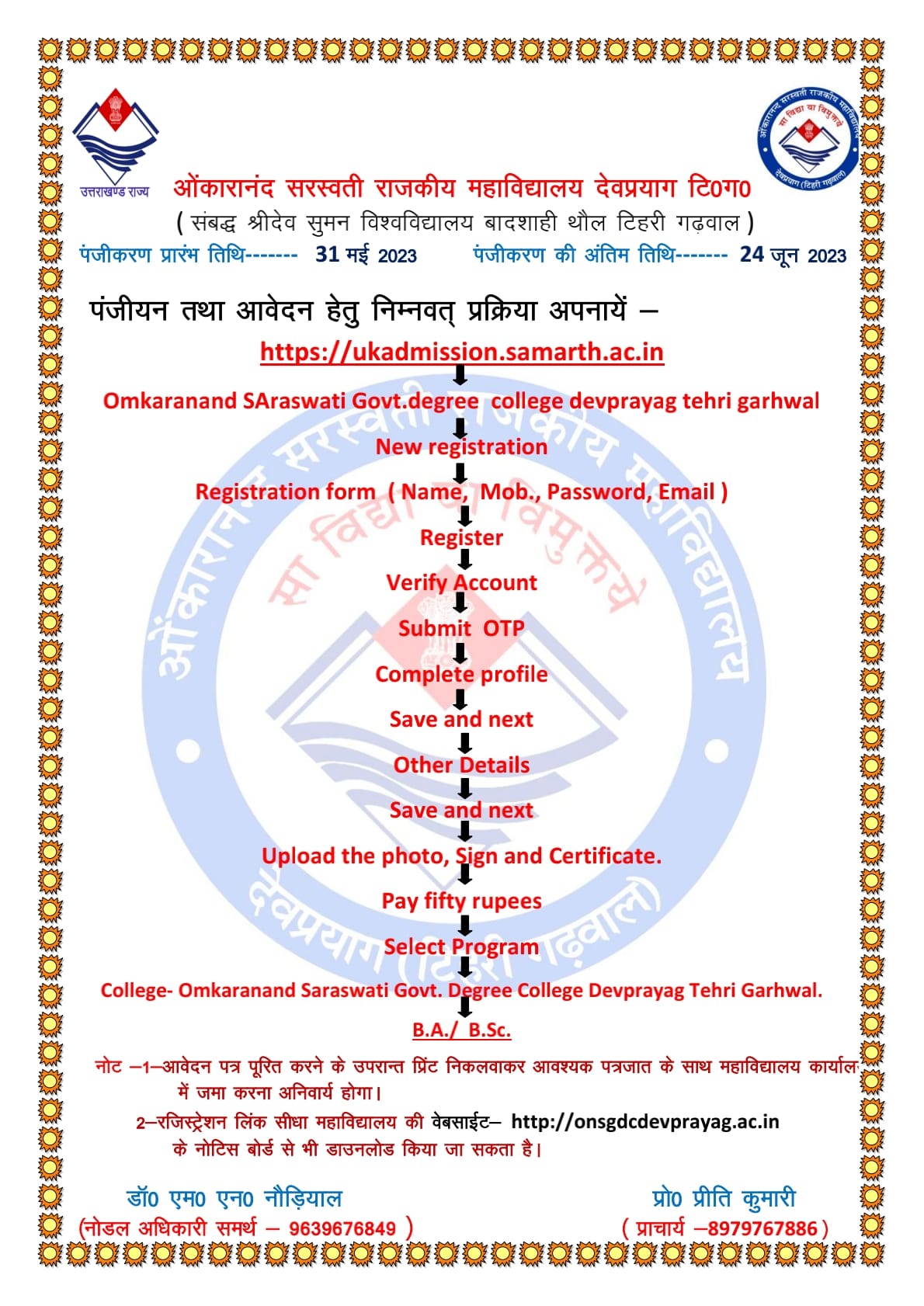 The foundation of Omkaranand Saraswati Government Degree College, Devprayag was laid by the Devprayag College Management Committee as ‘Devprayag College’ in 1984-85. The first session of the college commenced in the same year. Under the dynamic leadership and inspiration of Late Acharya Chakradhar Joshi Ji, the college was incepted with six subjects (Sanskrit, Hindi, English, Economics, History and Political Science) in the building constructed under the aegis of renowned Mumbai-based corporate Seth Naveen Chandra Mafatlal Group.